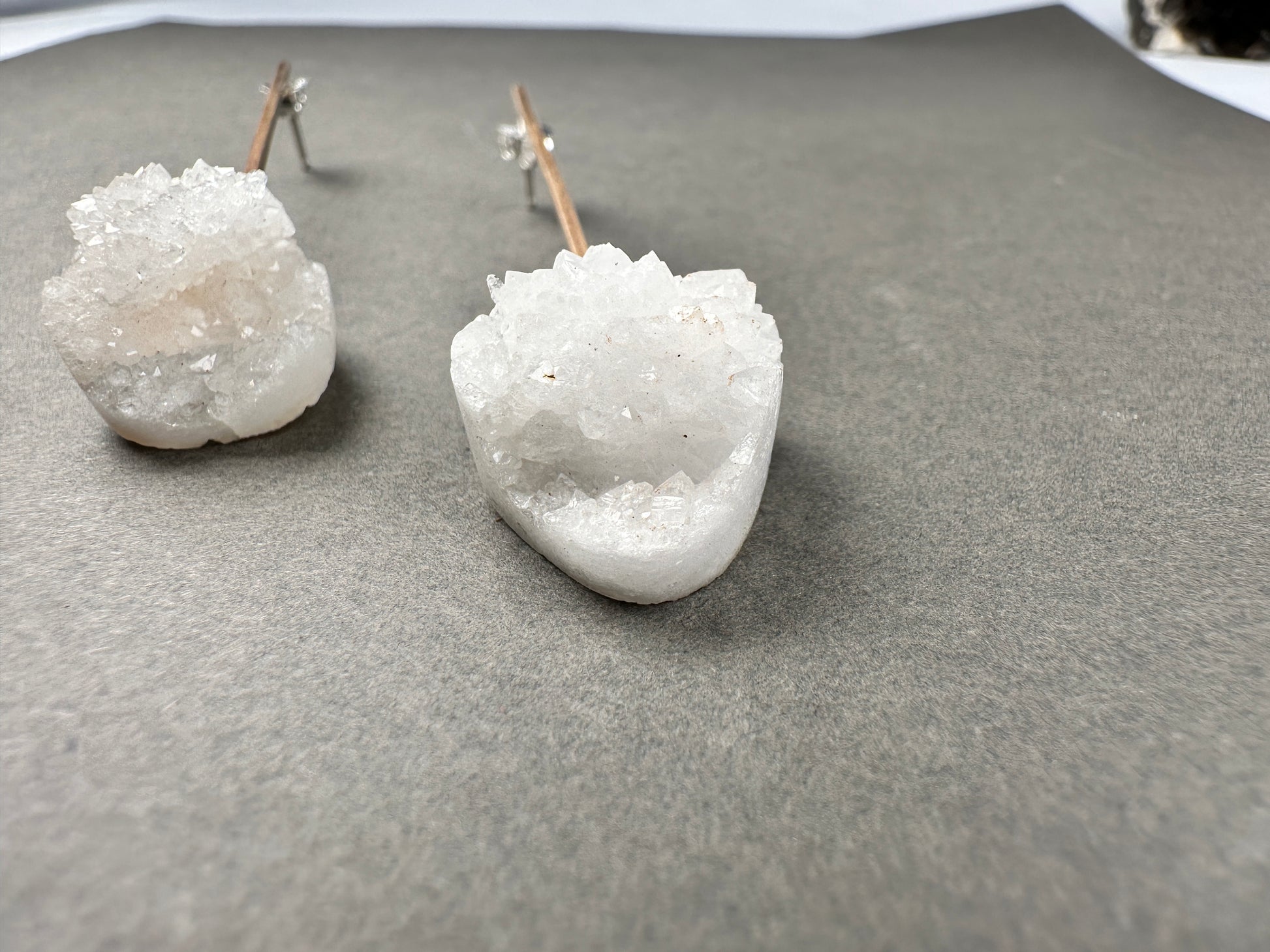 Snow-white druzy quartz, extracted from the heart of a geode and hand-cut, finishes this simple yet stunning set. Set on 14k gold-filled bars with .925 sterling silver posts and backs—clean, radiant, and grounded in natural beauty.