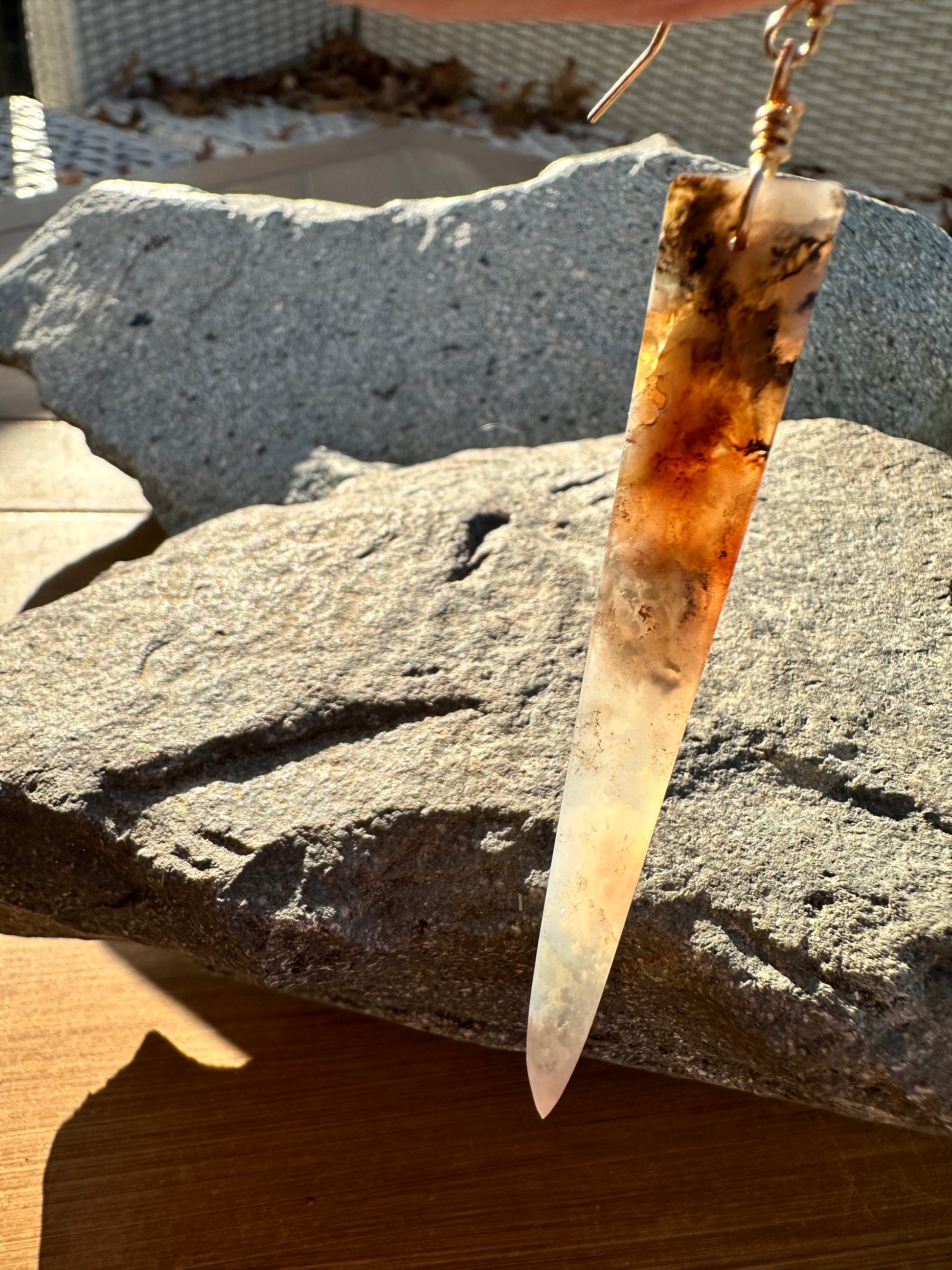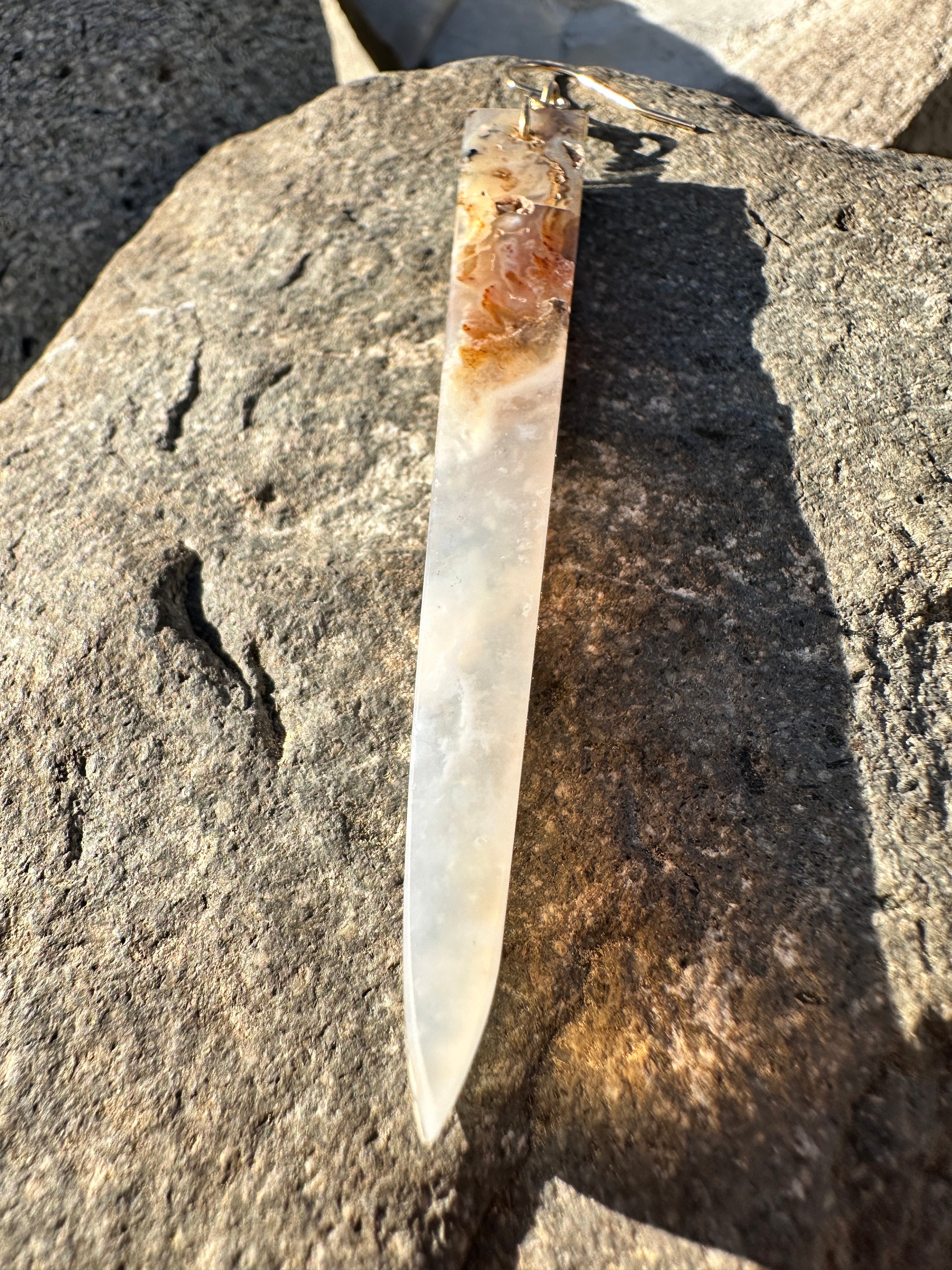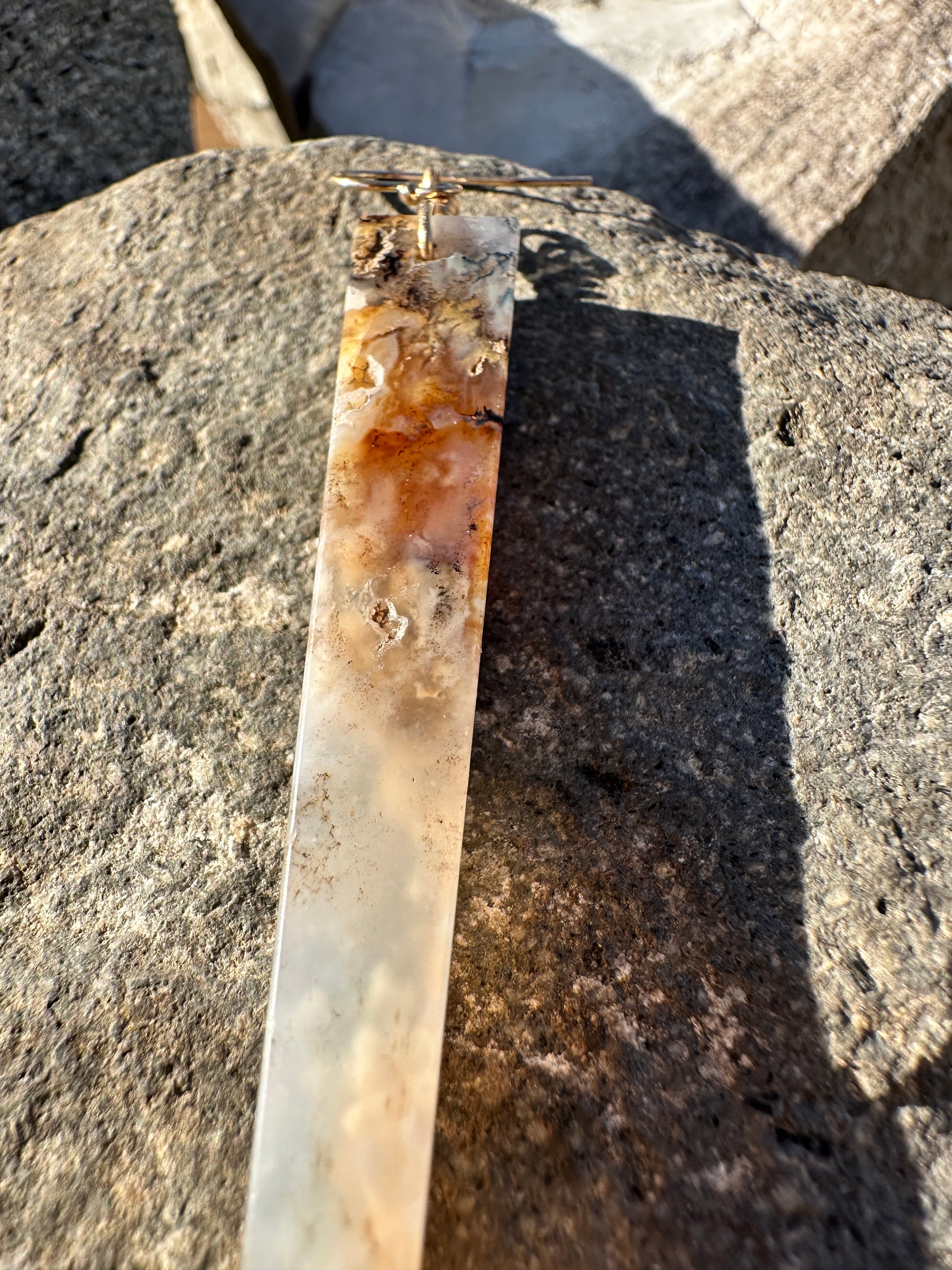 Long hand, polished graveyard plume agate spear on 14 karat gold filled metal