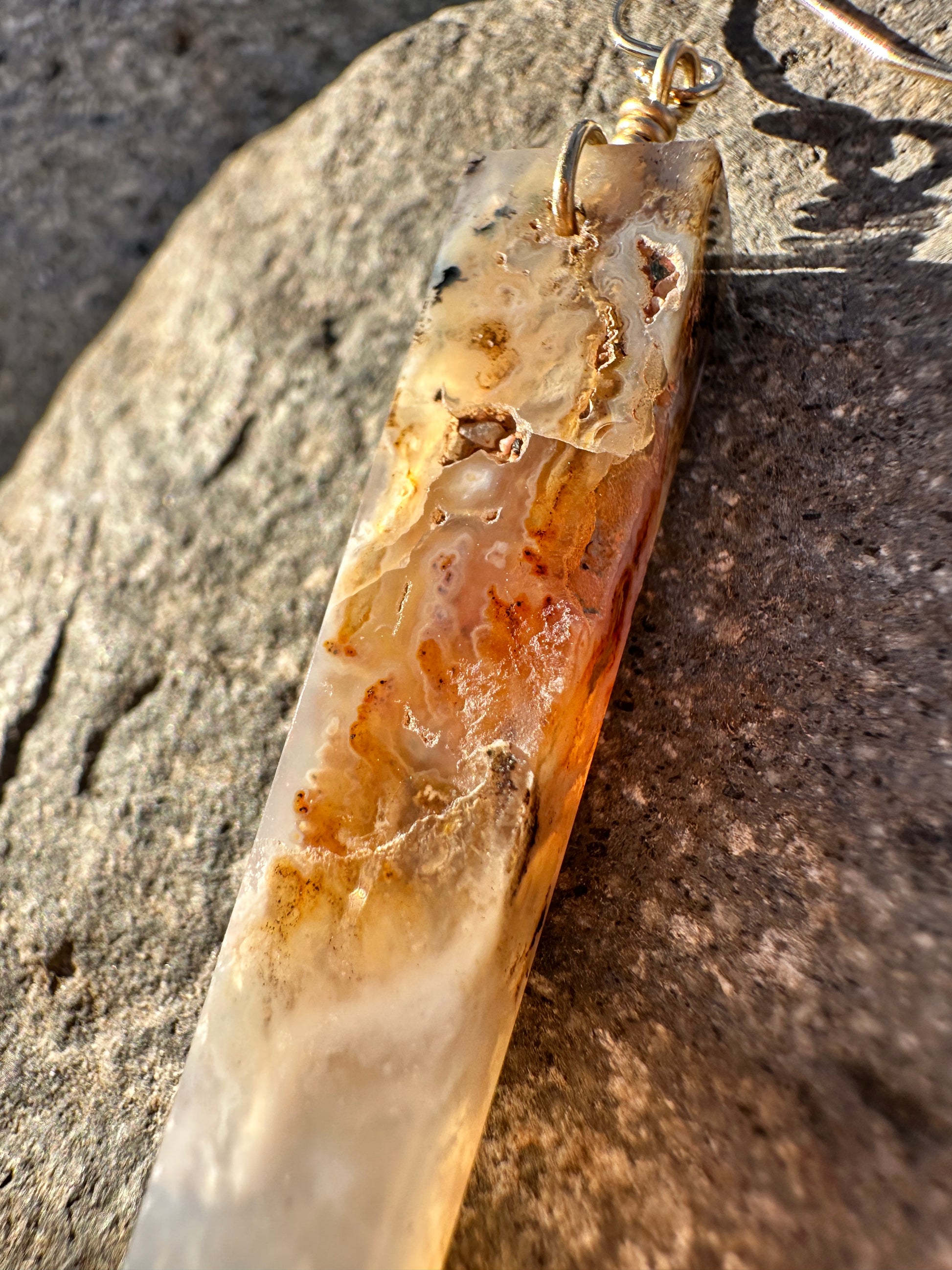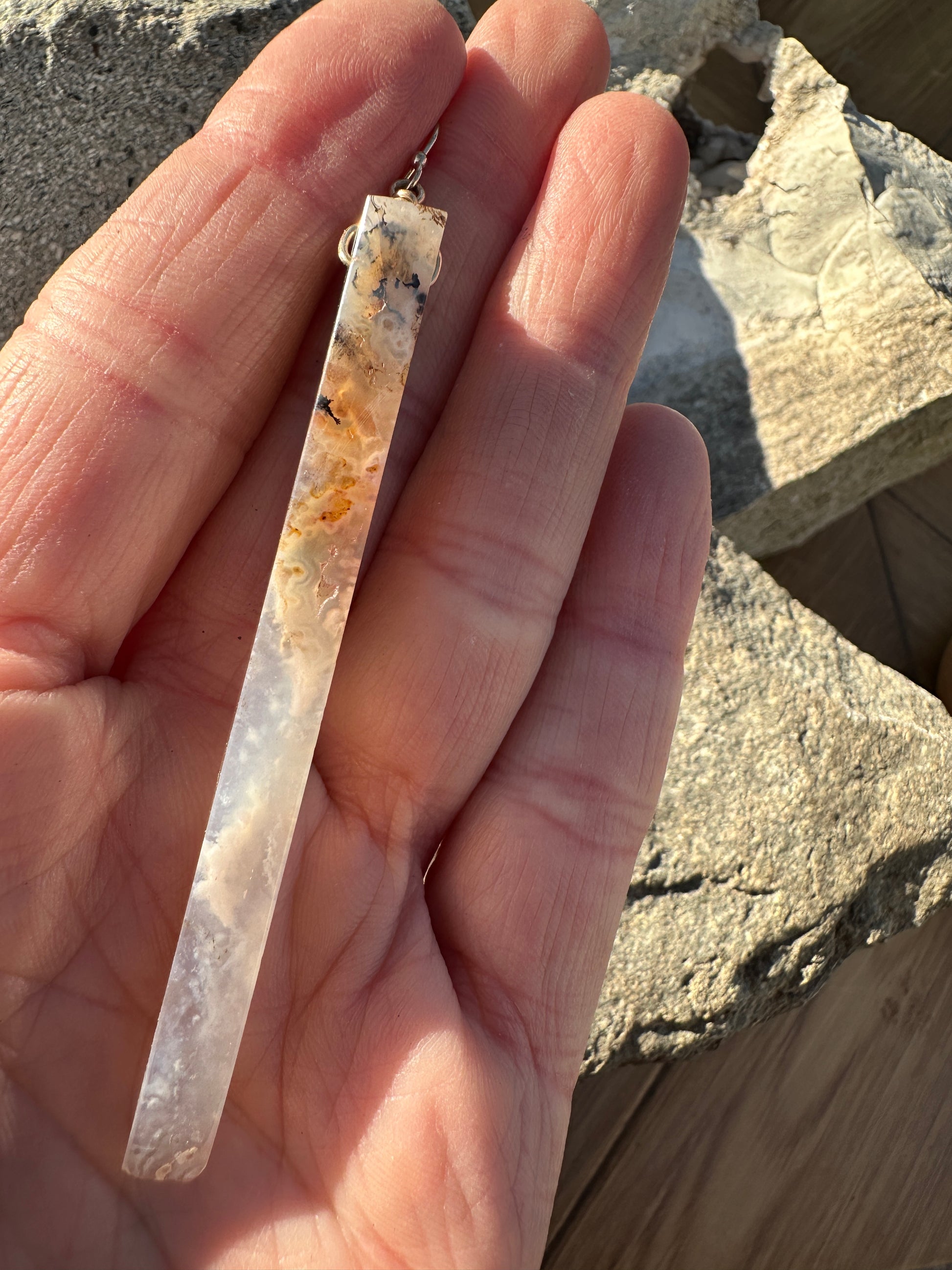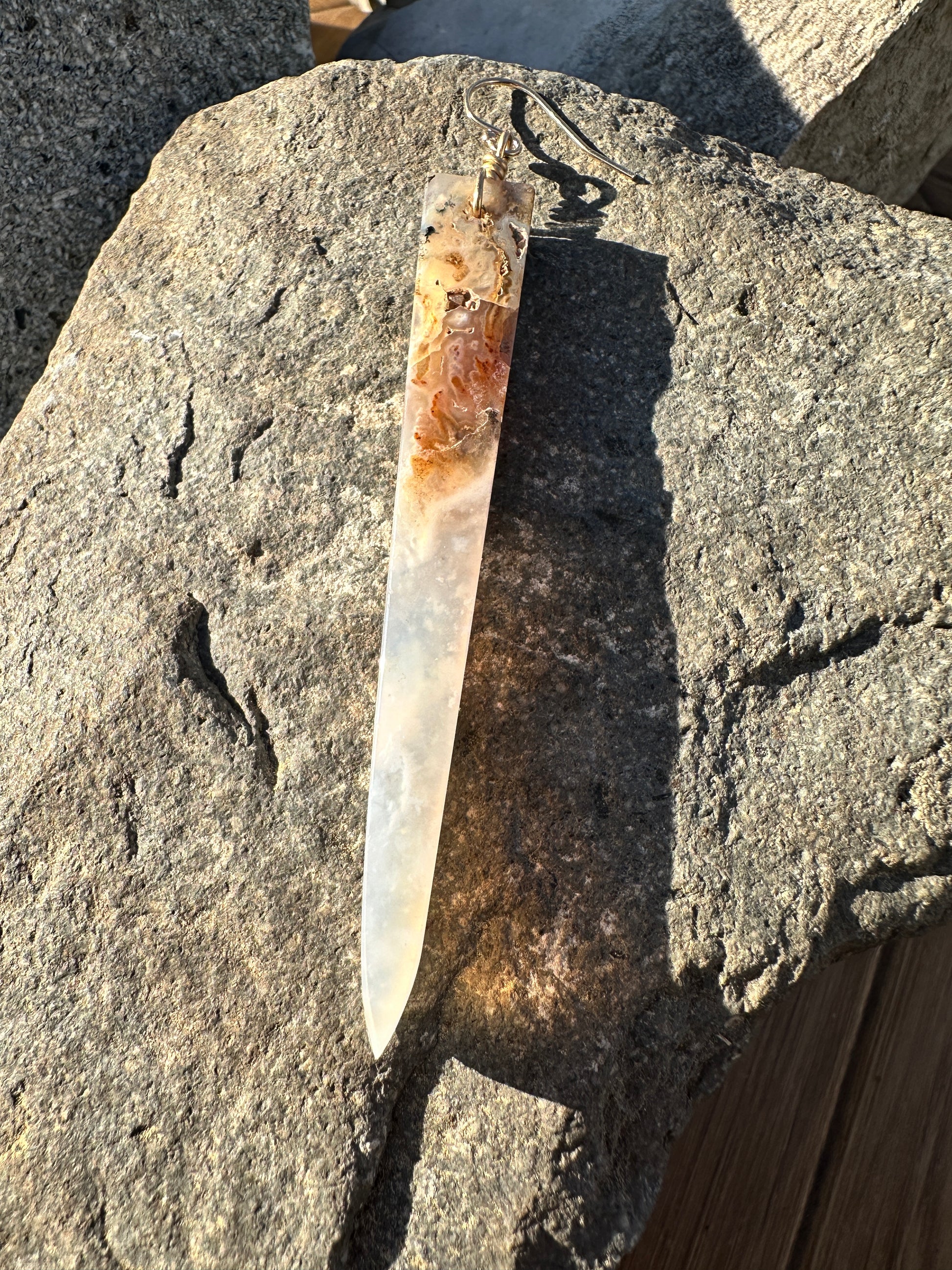 Long hand, polished graveyard plume agate spear on 14 karat gold filled metal