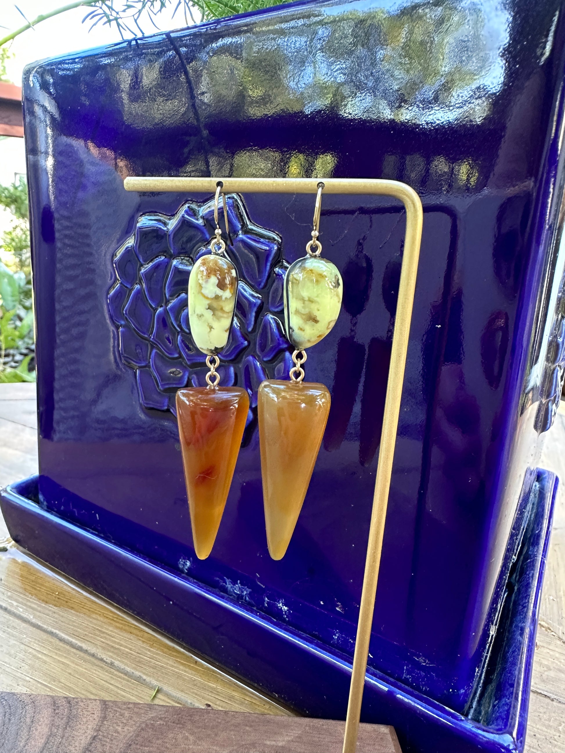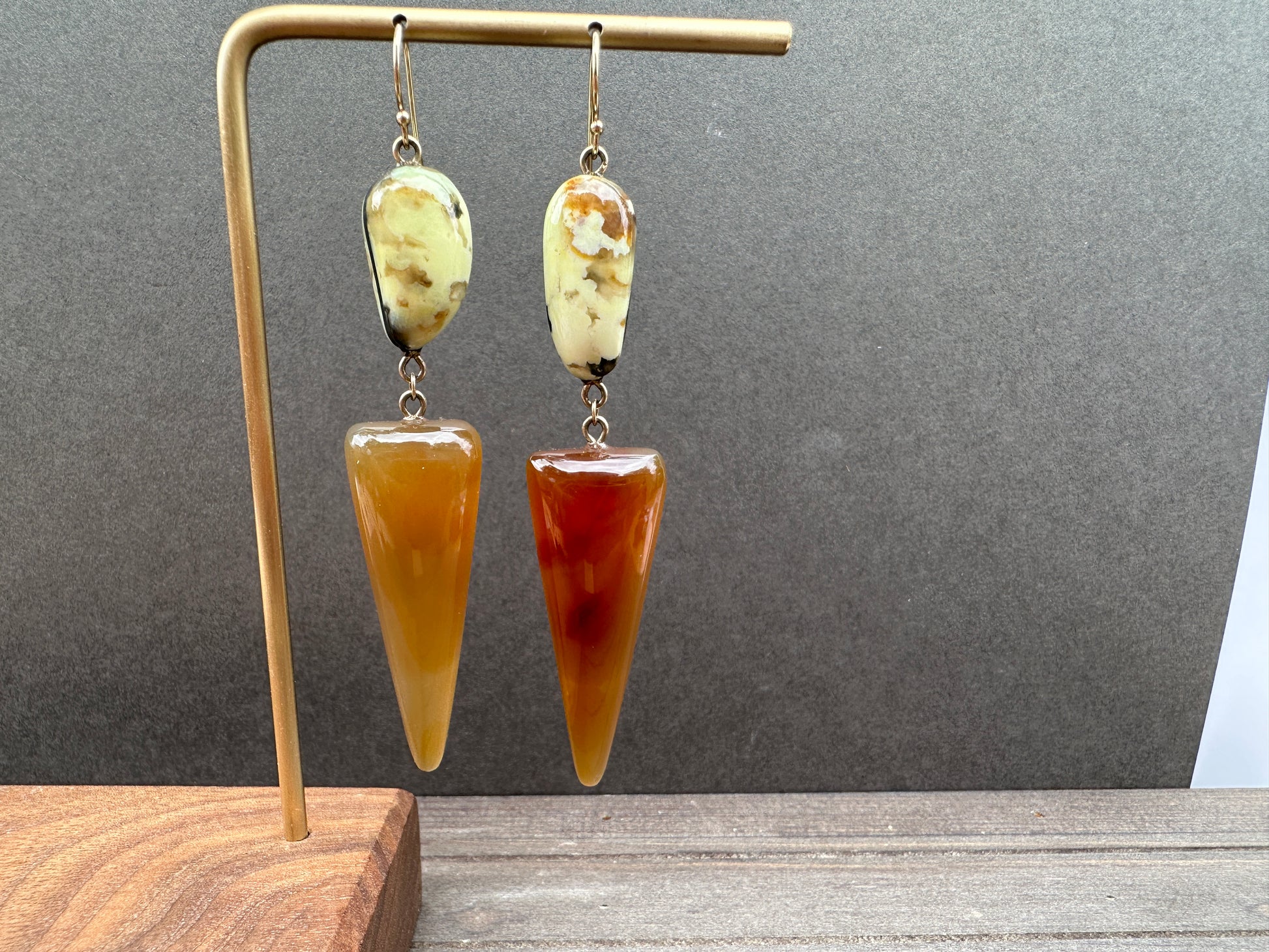 Brazilian agate phat spears and double-sided green opal nuggets on 14K gold ear wire