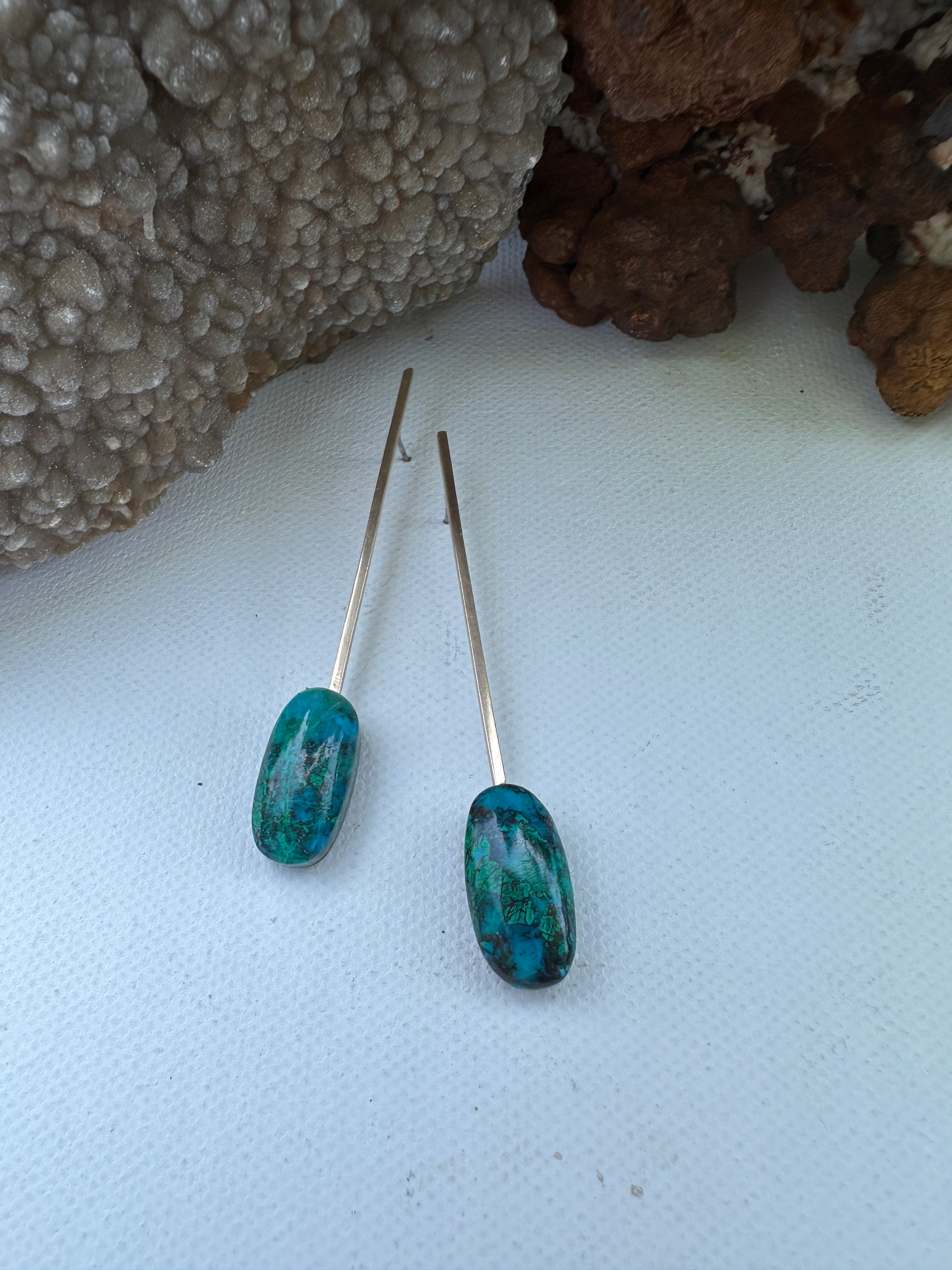Stellar mixto of malachite, chrysocolla with red cuprite veins throughout. Melat is 14K gold filled bar with sterling silver ear post.