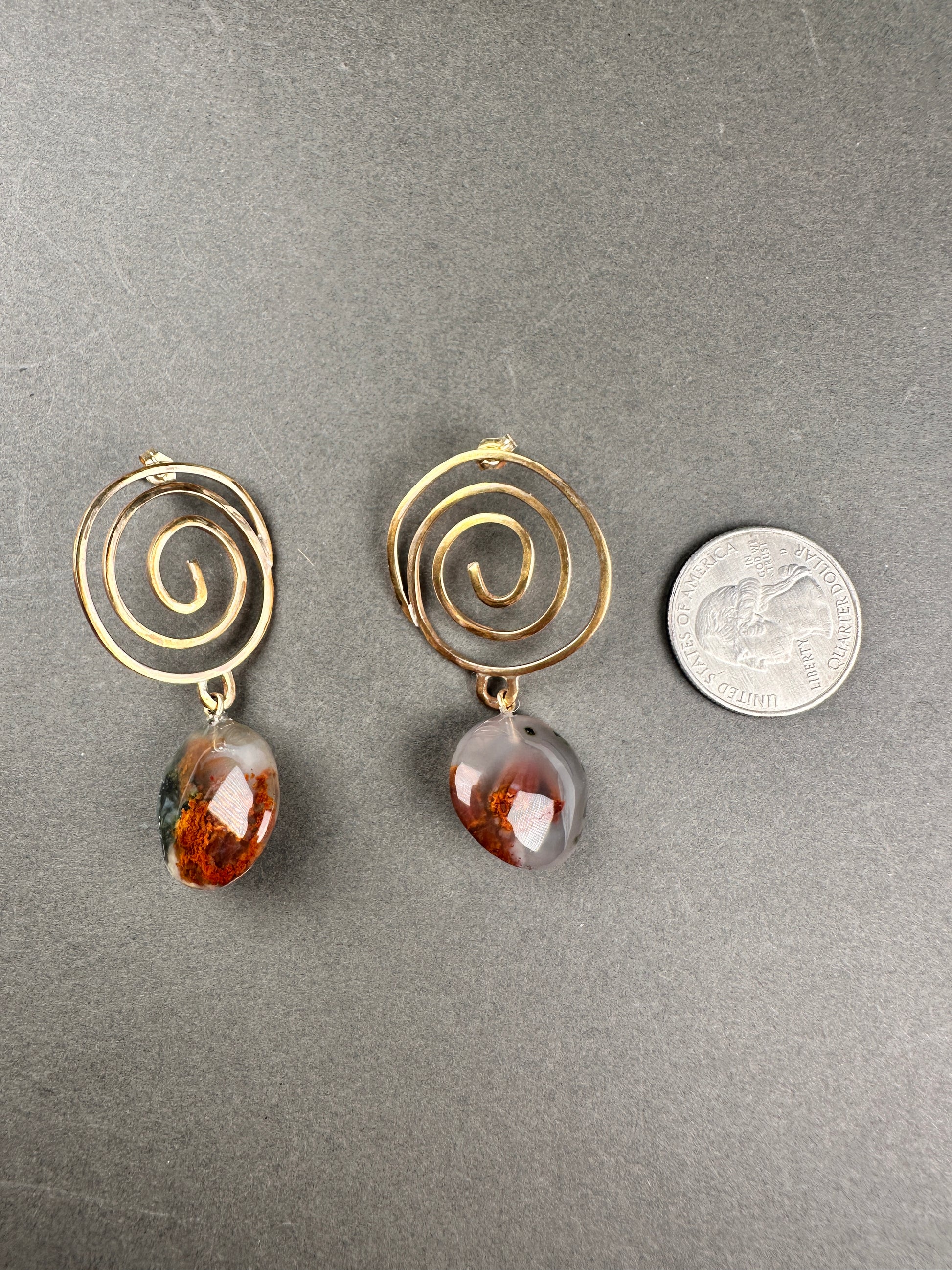 Hand cut and polished moss agate with swirling puffs of red and green suspended from distressed 14k gold filled spirals with .925 sterling silver posts and backs. Distressed metal reveals brass center to beautifully deepen in color with age.
