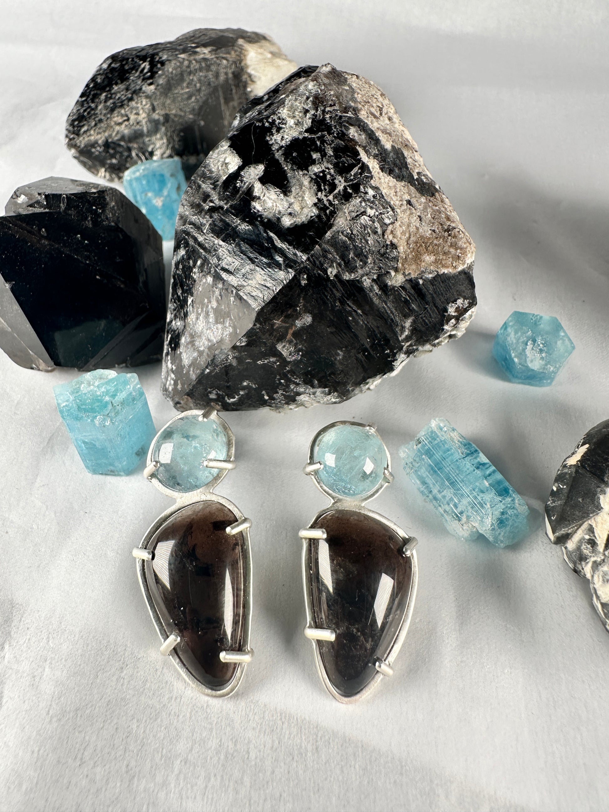 The aquamarine’s clear, oceanic blue contrasts beautifully with the deep, shadowy tones of the smoky quartz. Together, they create a powerful and elegant harmony of color, clarity, and contrast—each stone enhancing the other’s natural brilliance.