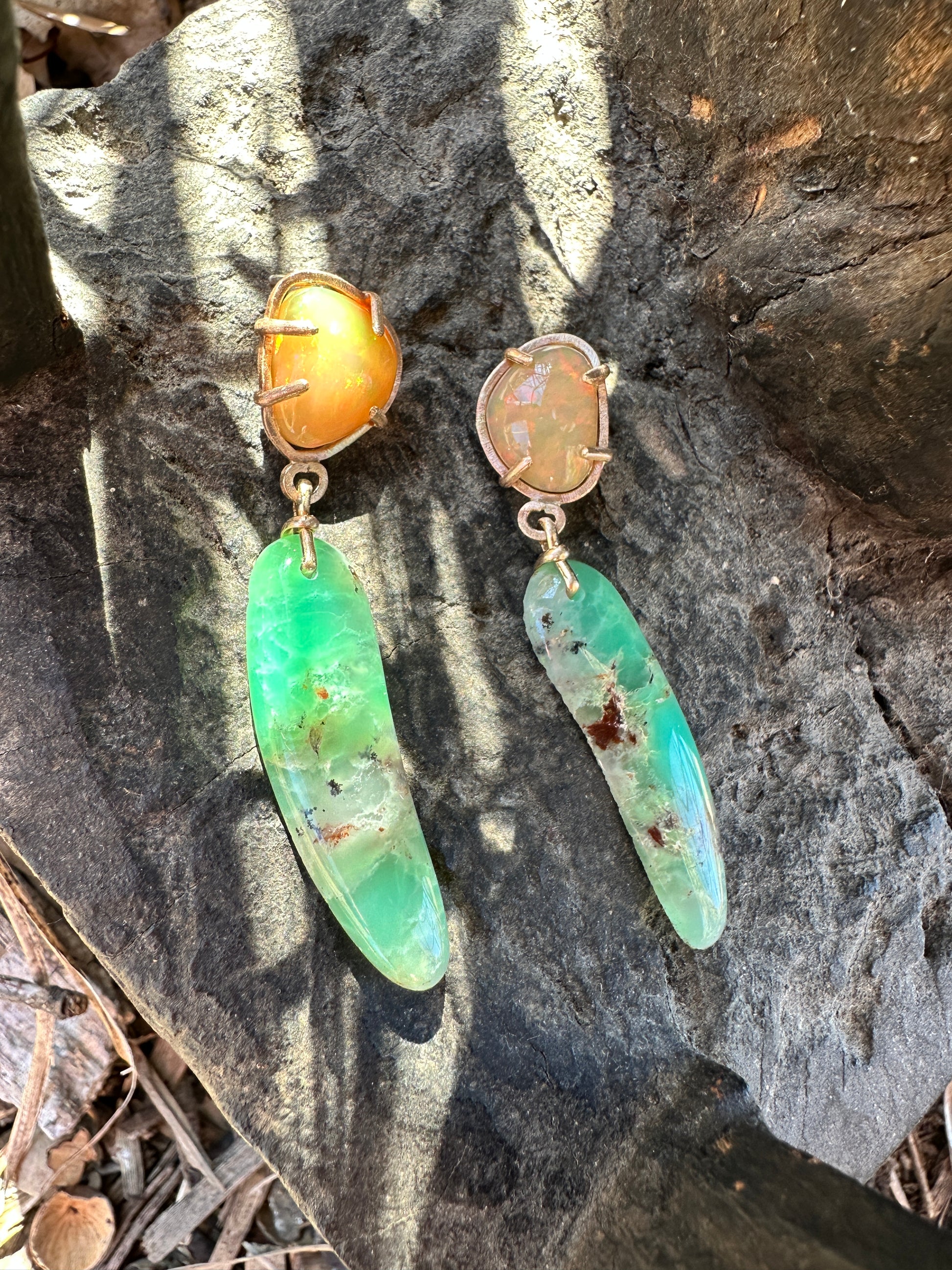 Ethiopian opal and chrysoprase on polished 14k gold filled. base metal will show through the polished surface revealing a layered patina over time