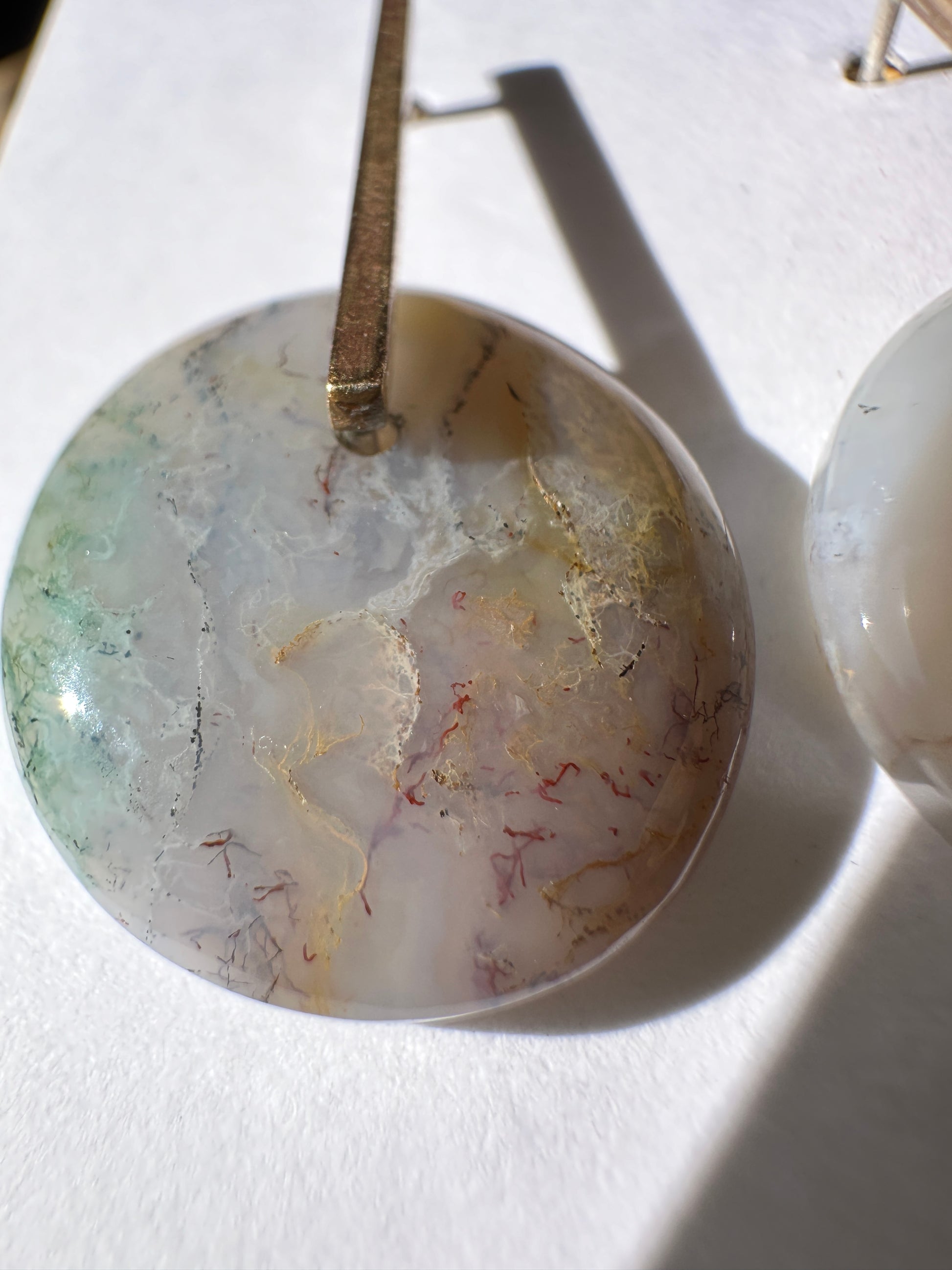 Milky agate with tiny colorful veins on 14k gold bar with .925 sterling silver ear post