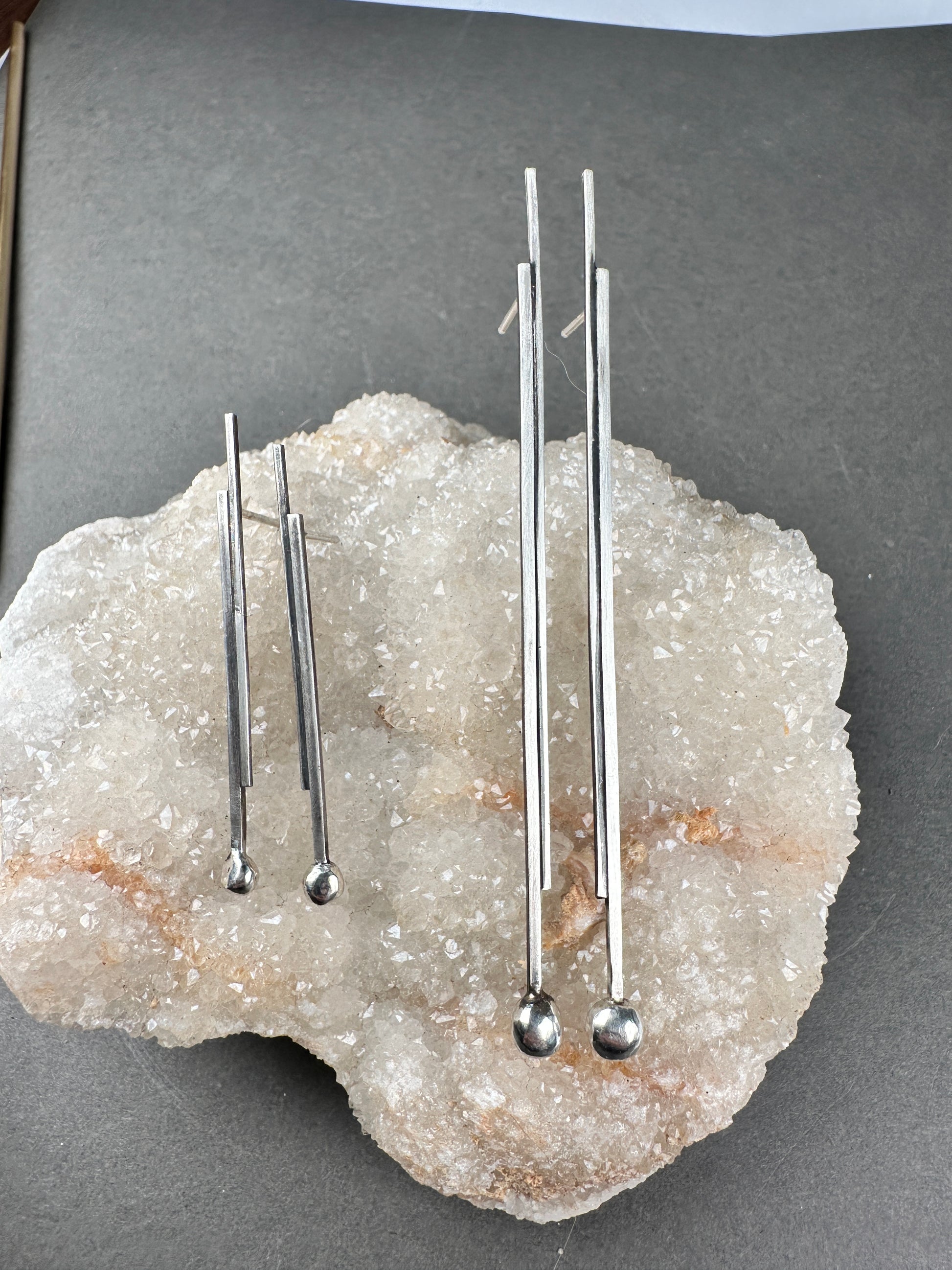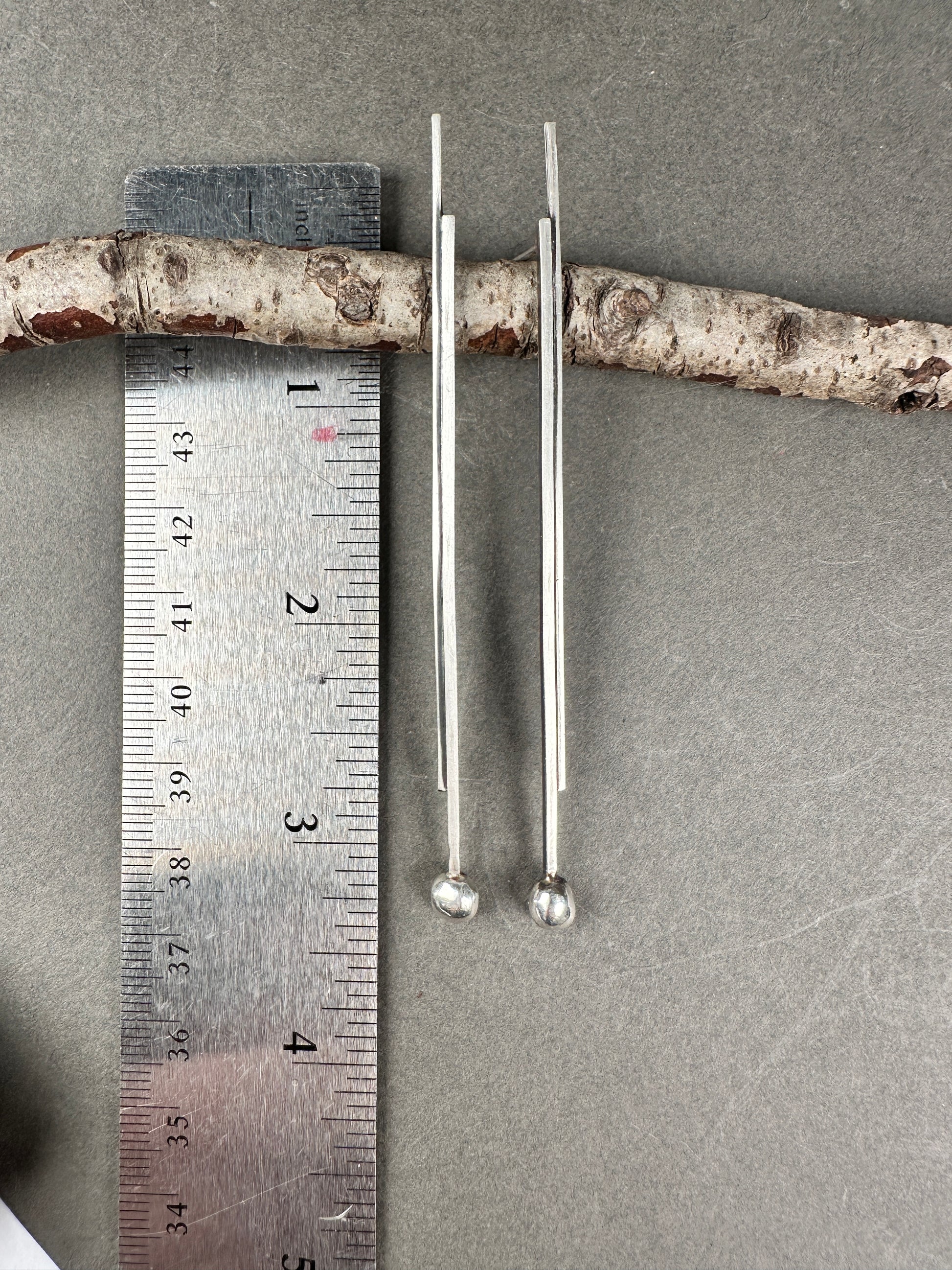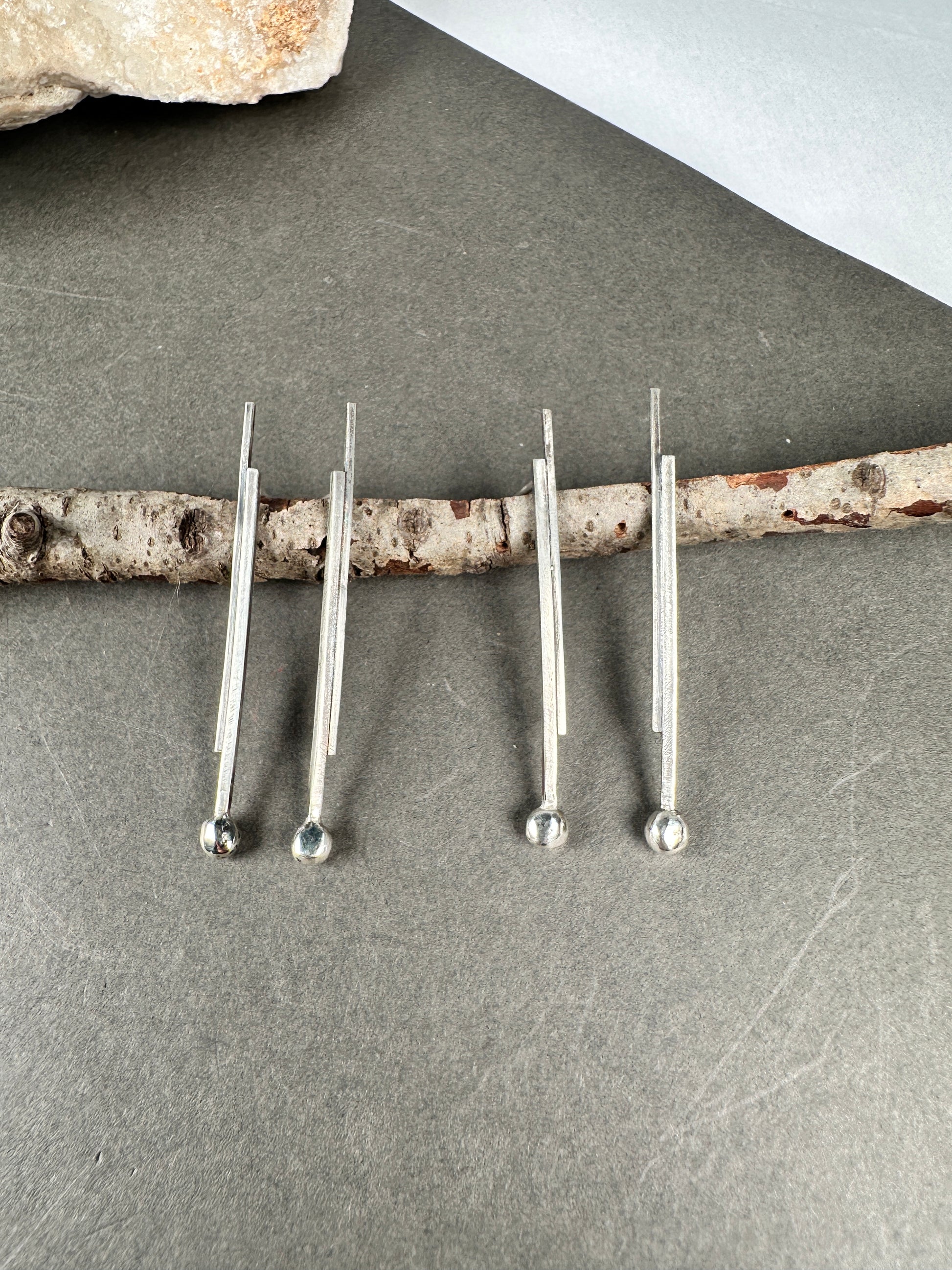 Slender silver bars with a distressed finish, paired with a polished, gleaming recycled silver ball. Balances, lightweight, airy, and beautifully face-framing.