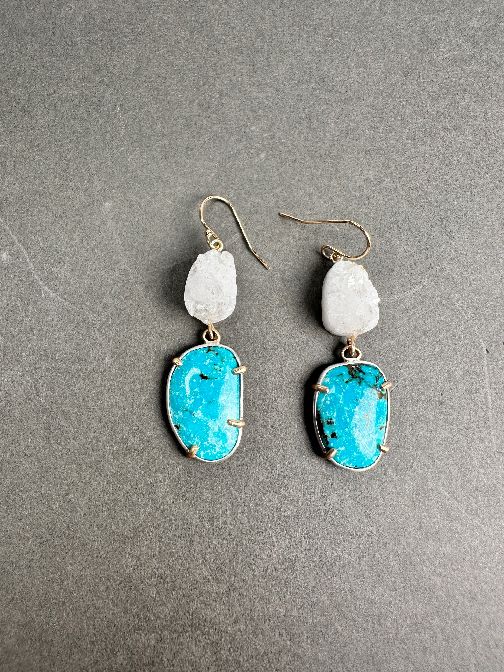 Kingman turquoise set in sterling silver and 12k gold-filled prongs alongside snow white druzy quartz from the center of a hand cut geode, finished with 12k gold ear wire